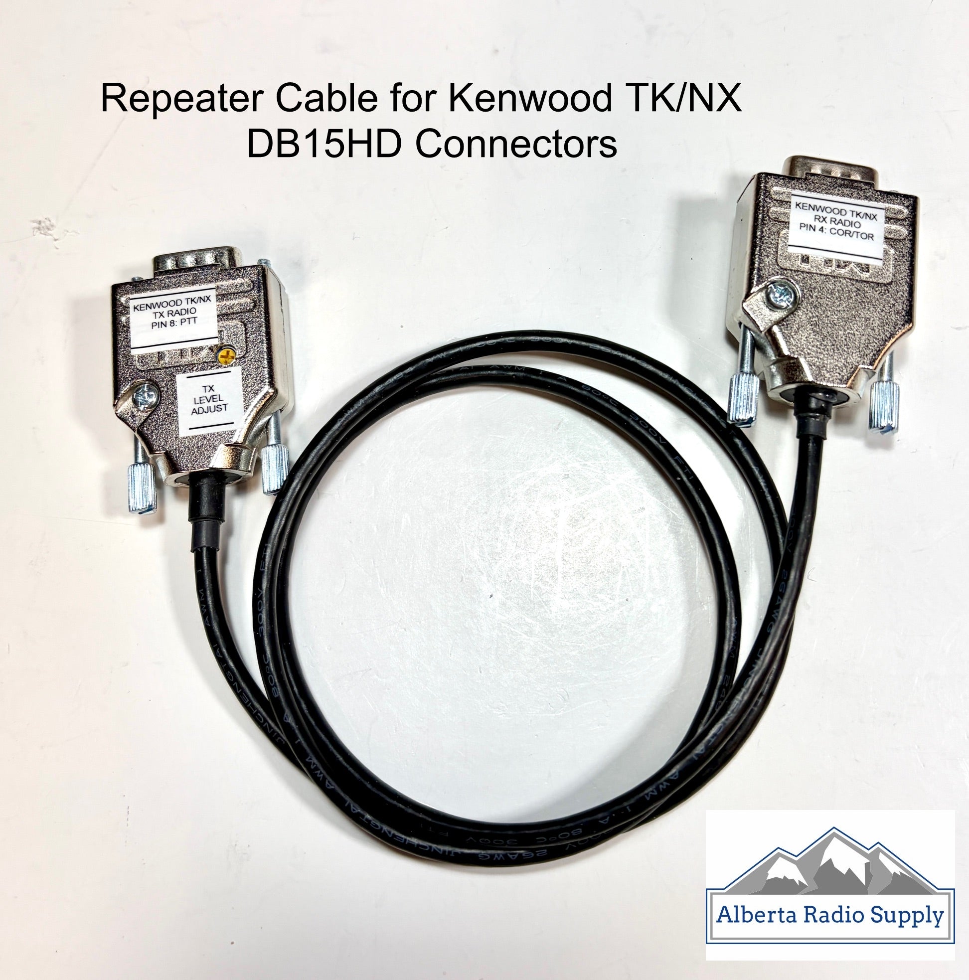 Dual DB15HD Cable designed to create a simple RX/TX repeater using 2 Kenwood TK-7360 or similar Mobiles (radios not included). This cable has no TX hangtime.