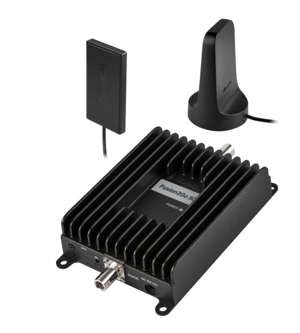 KIT CONTENTS: High-performance Fusion2Go 5G booster, exterior magnet-mount antenna, interior