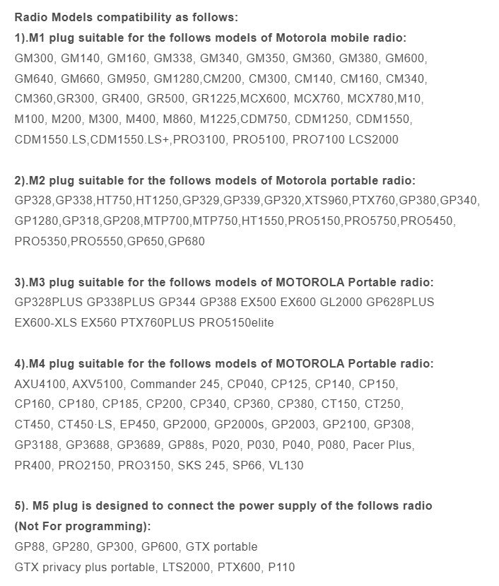 Note: This cable has been tested and confirmed to program CM200 / CM300 / PM400 radios without the need for an adaptor cable.